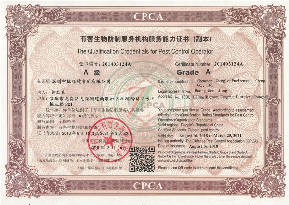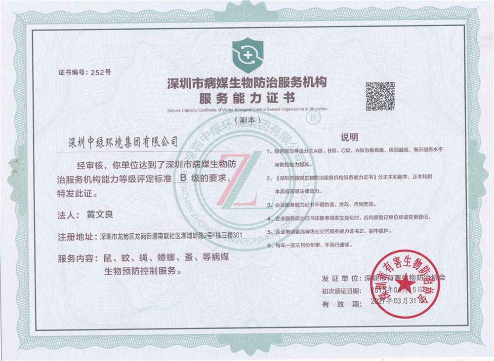 深圳市病媒生物防治服務機構服務能力證書B級